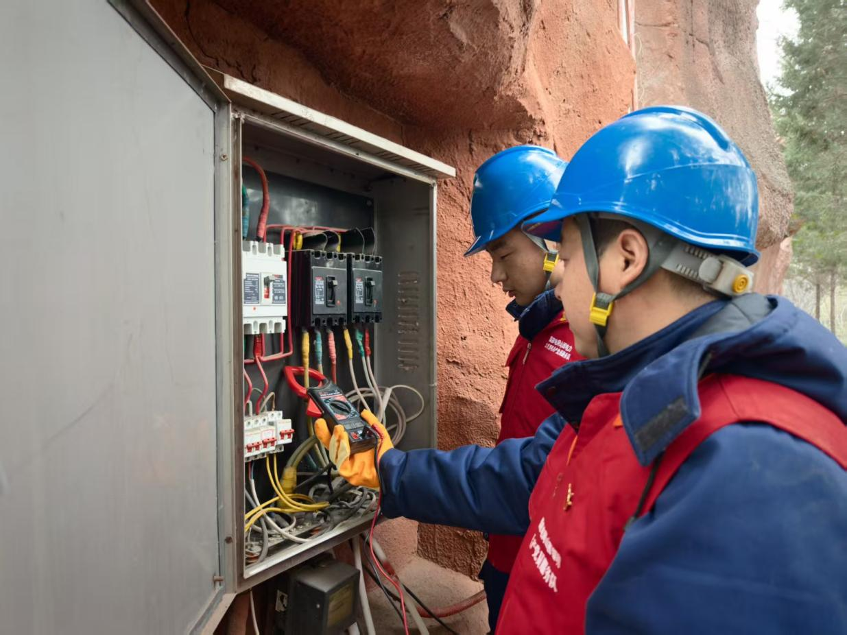 在洪洞大槐树景区,“两队”队员们仔细对景区内的供电线路及配电设备进行测温巡视,记载每项数据,并对配电柜进行逐项查看,使用钳形电流表丈量各分路电流,查看接线是不是松动、发热,保证电气设备正常运转状况良好。