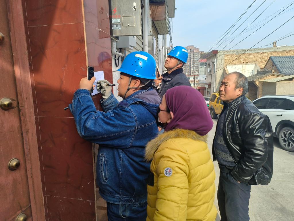 米祥仁供电所作业人员张伟(左一)和刘平(左二)为来电大众处理问题。新华社记者 王紫轩 摄